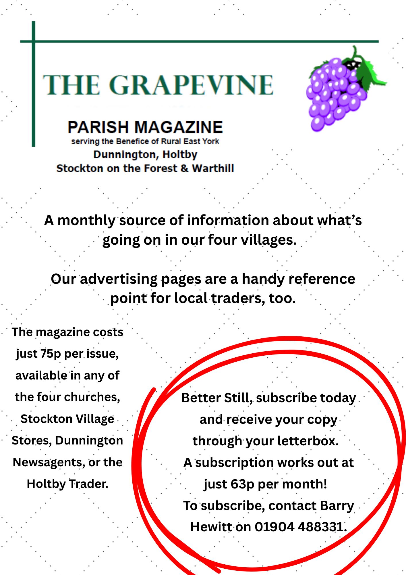The Grapevine can also be bought for 75p a copy in any of the Parish Churches, the Newsagent in Dunnington, Holtby Trader and Stockton on the Forest Village Store.
